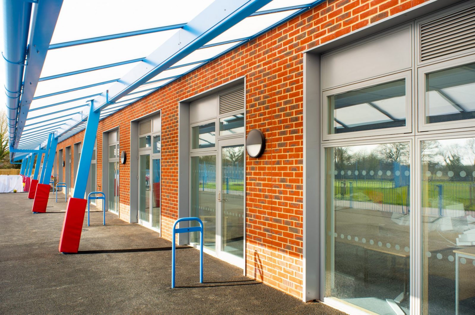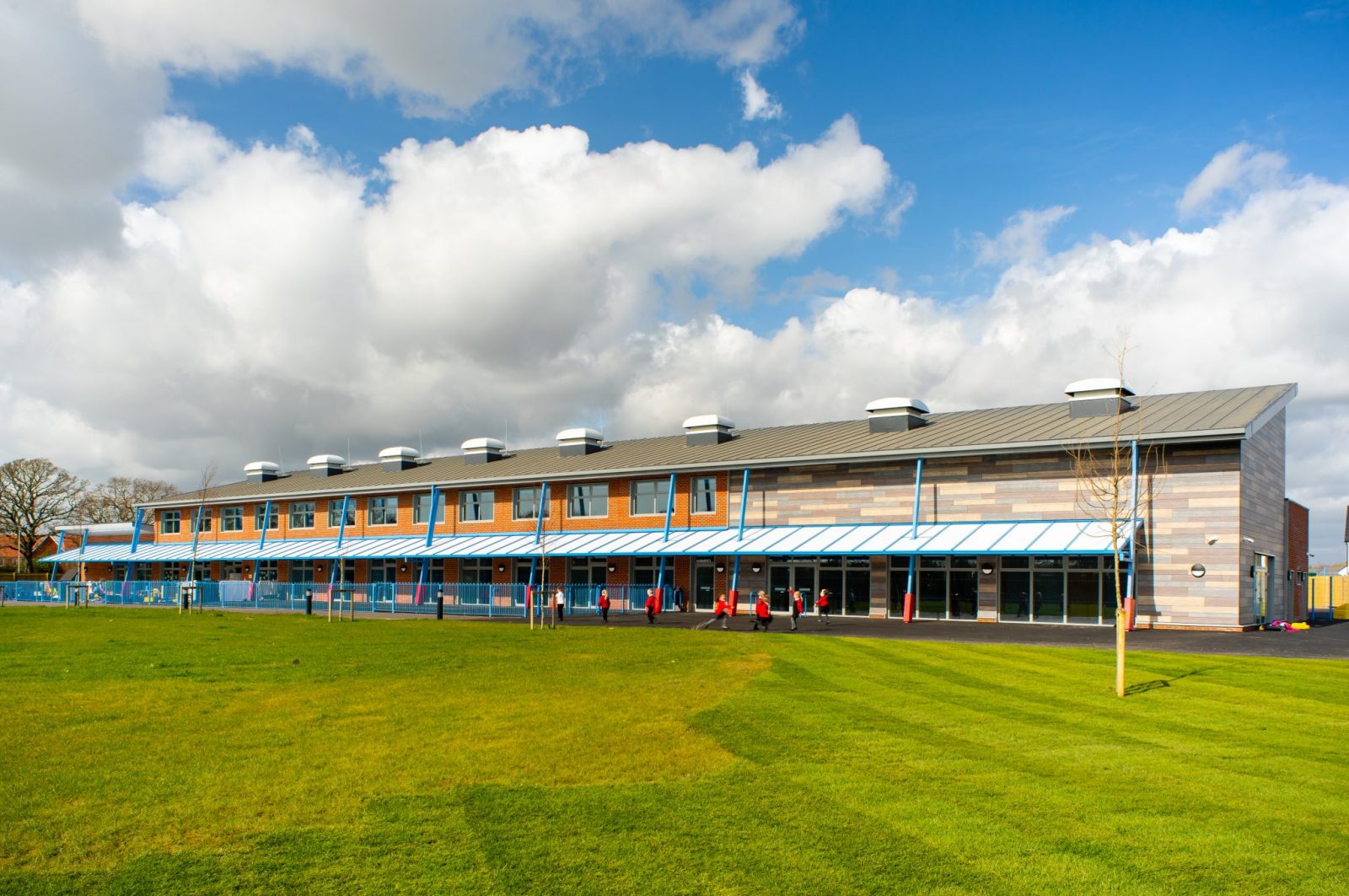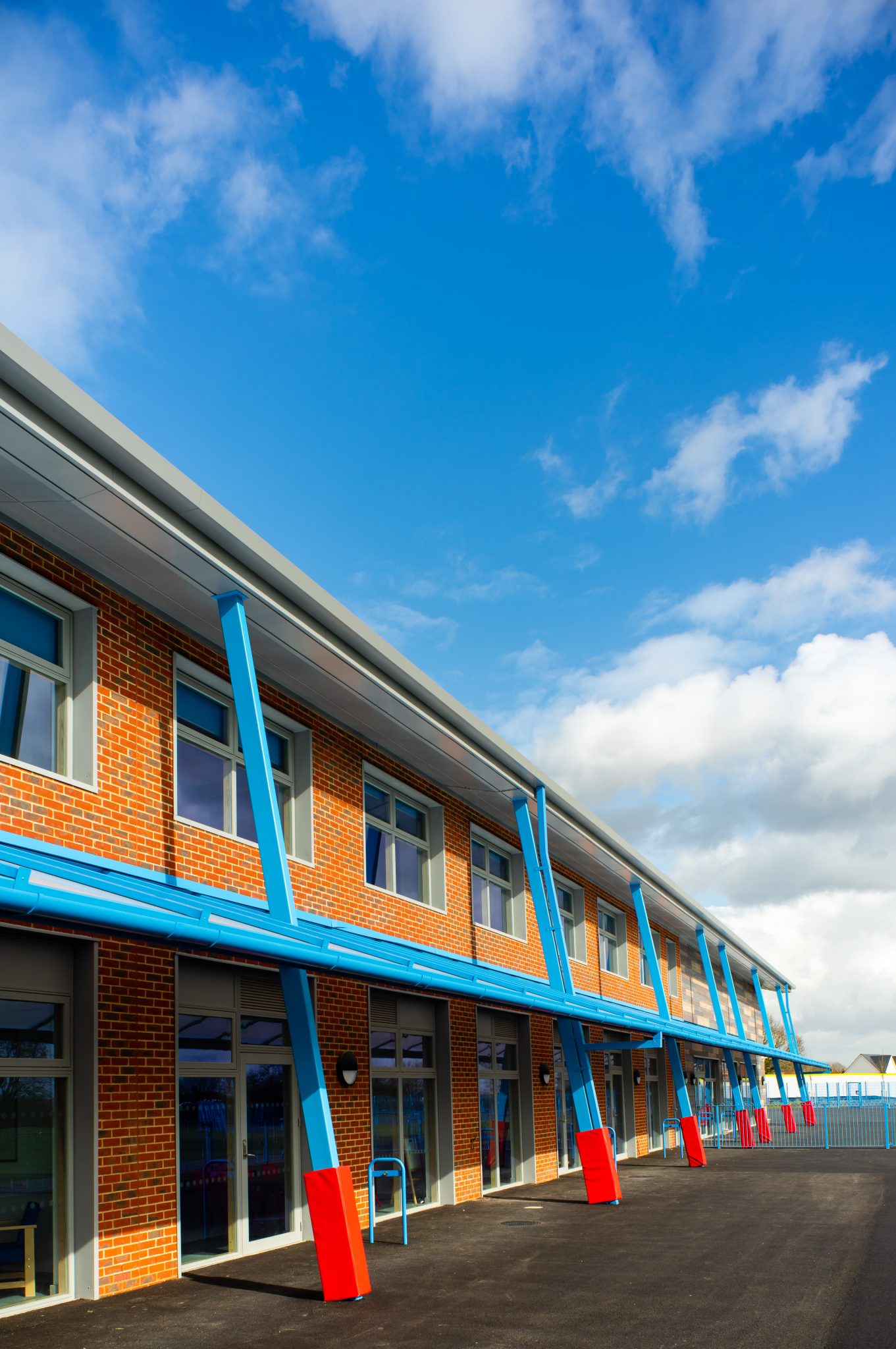 The stylish form of the building is a mixture of single and two storey elements broken up using a combination of mono-pitch and flat roof sections along the length of the building. Externally finishes of brickwork and wood effect cladding give the building a natural and harmonious feel which is offset by the pops of blue used for the external canopies, whilst internally the classrooms are light and spacious due to vaulted ceilings and high level windows creating the perfect environment for learning.