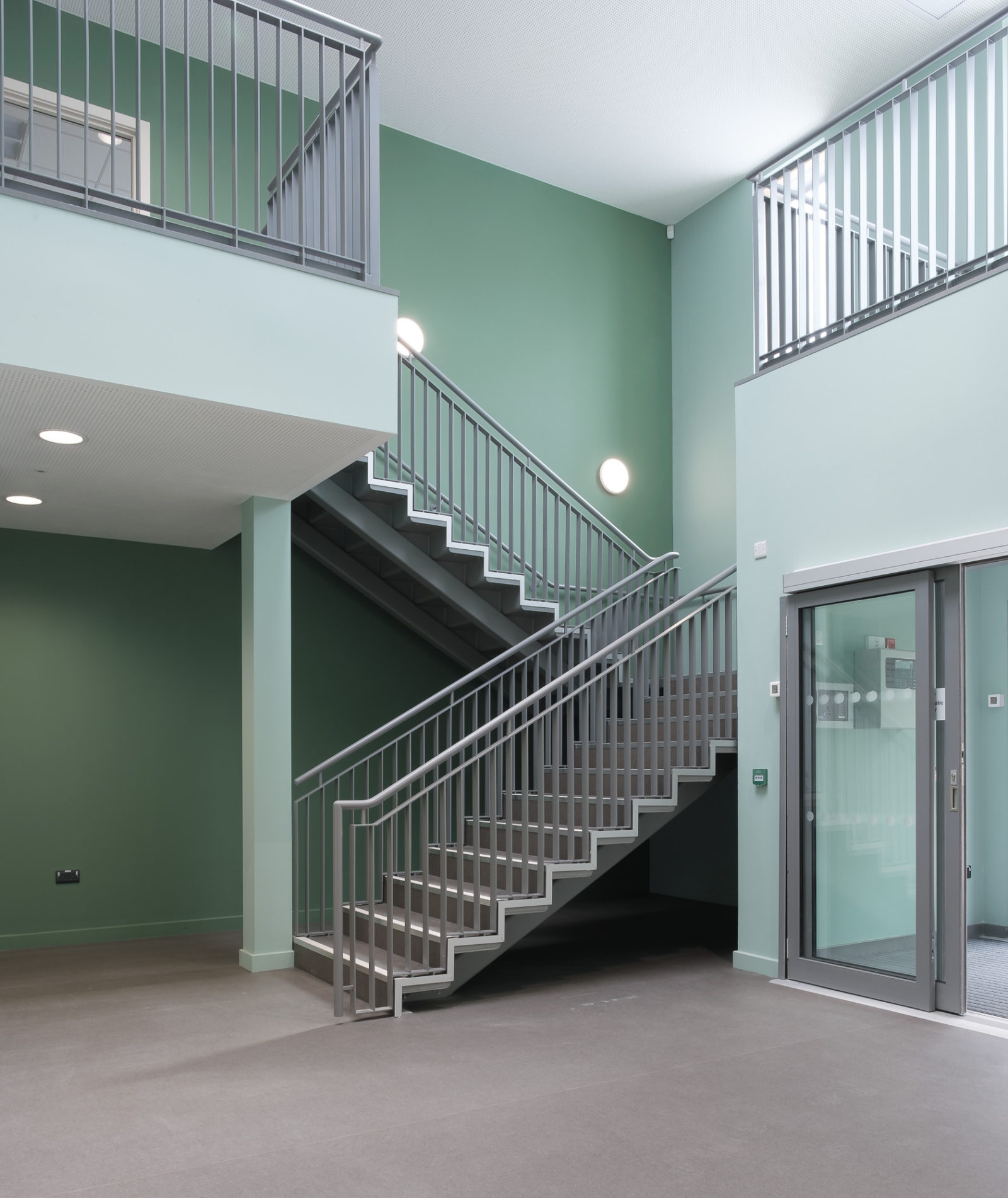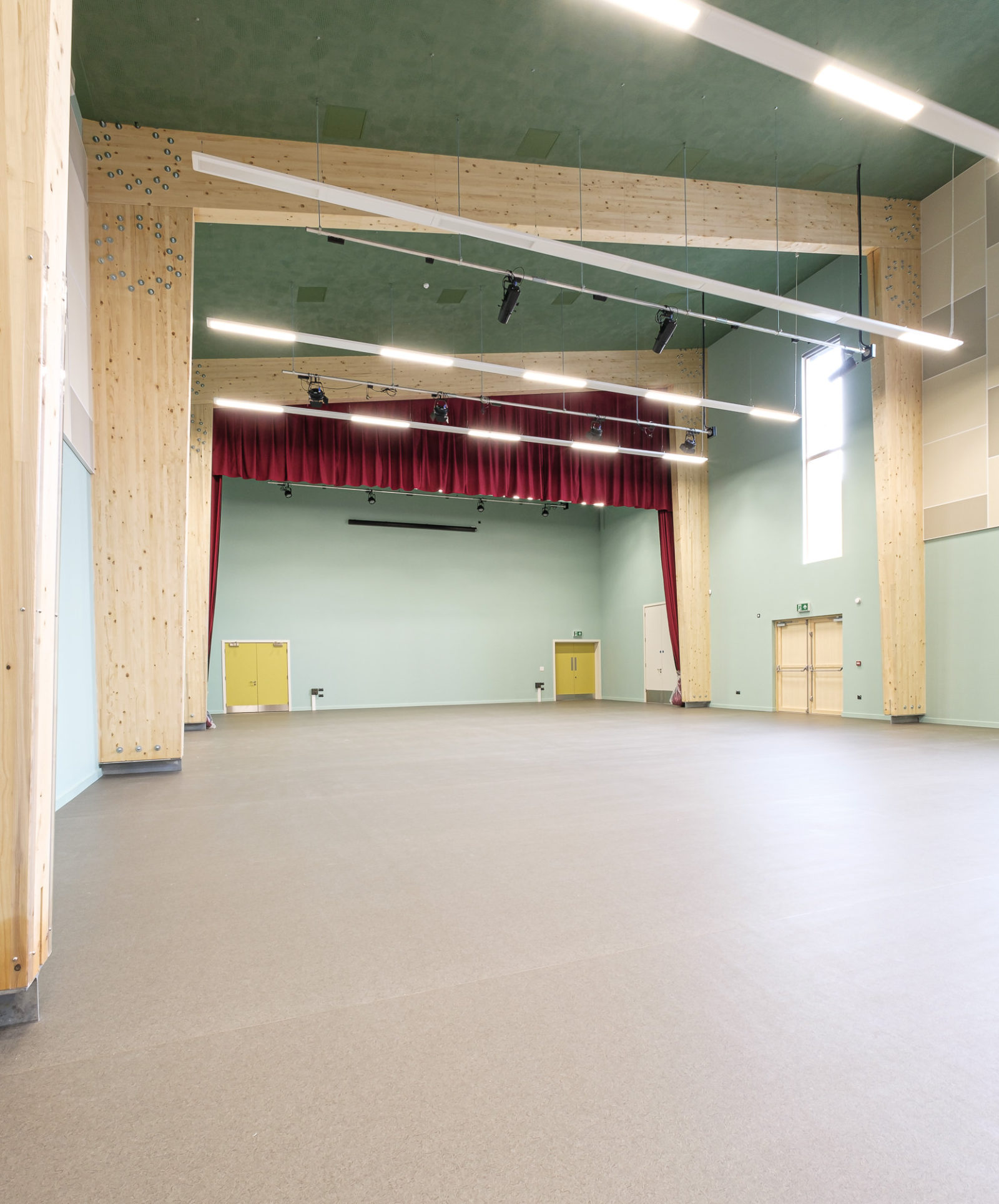 Externally the new building is clad with multiple different cladding types including diamond shape zinc shingle and polished ceramic brick slips, all to stunning effect. Internally key features include the three large 10m high glulam portal frames to the theatre. The glulam posts and beams forming the portal frames were connected using 3.5 tonnes of steel flitch and base plates all pre-drilled off site to exacting precision enabling our site crews to effortlessly construct the portal frames on site. One of the key technical factors when designing and constructing the medical centre was ensuring the onerous acoustic requirements were met. Following close collaboration between Streif designers and the acoustic consultants a number of key details were incorporated into the design and construction of the Streif wall panels to ensure flanking sound was eliminated between the consulting rooms.
