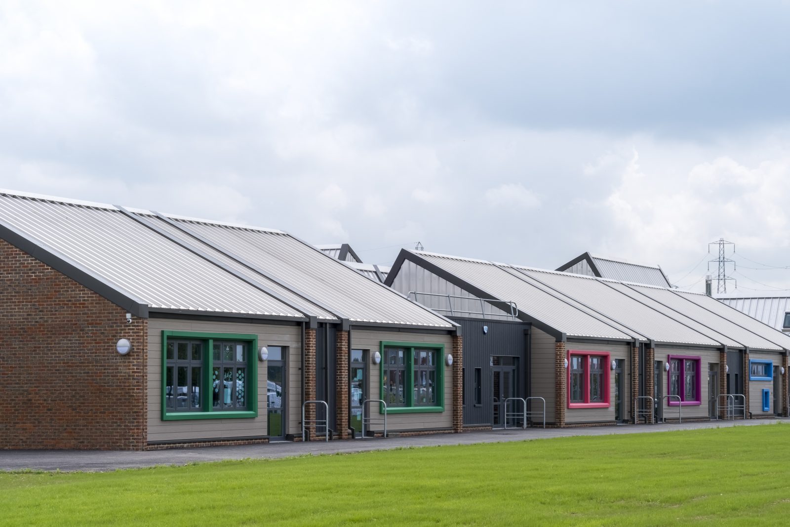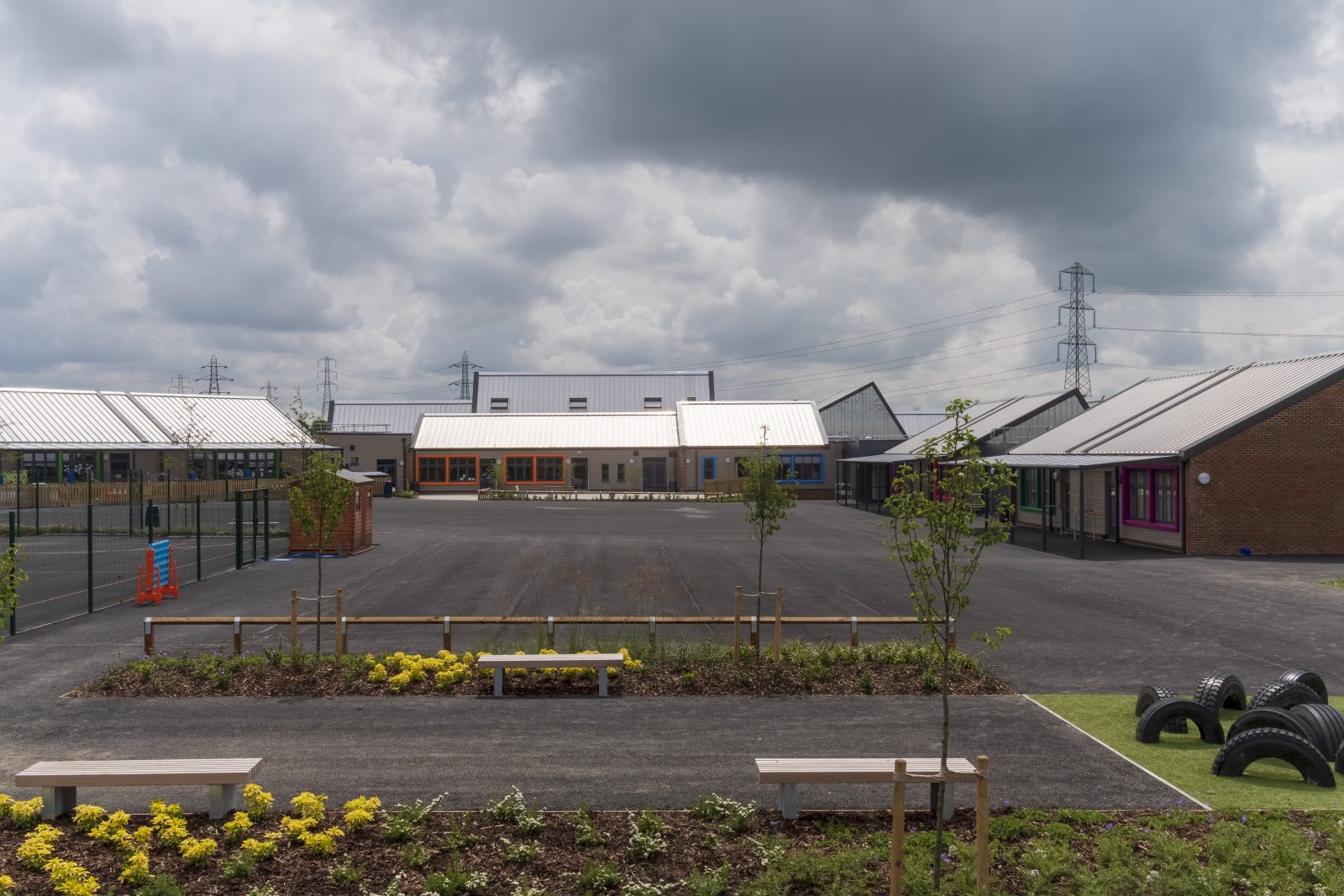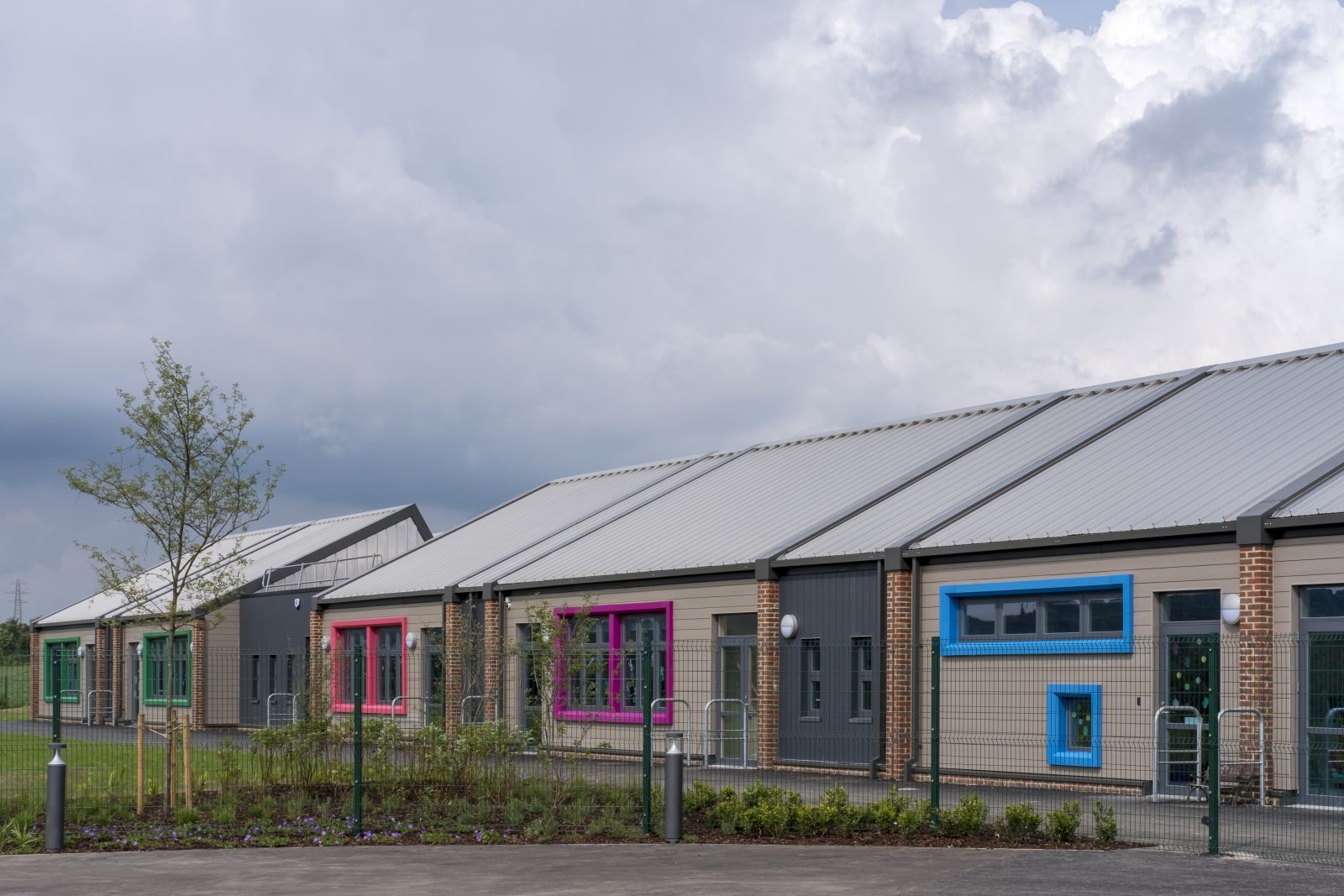 The building is arranged as a single storey horseshoe design, laid out around a central play area with multiple changes in roof levels and forms. Externally the facades are broken up by the bold use of colour and materials, whilst internally the classrooms are characterized by brightness and height.